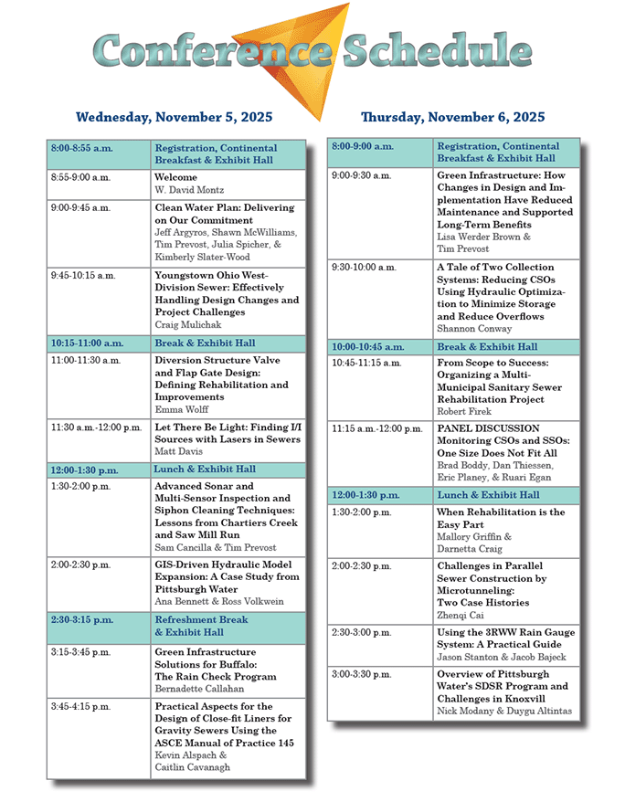 Each year more than 400 municipal officials, engineers, managers, public works directors and wet weather experts attend the 3 Rivers Wet Weather Sewer Conference to learn, educate and share experiences for overcoming the wet weather problems that have plagued the Pittsburgh region for decades. More than 90 exhibitors share their products and services while local, regional and national speakers present educational sessions on a variety of wet weather issues. The conference spans both the North and South Halls, which provides spacious accommodations for both the educational sessions as well as the exhibit hall.